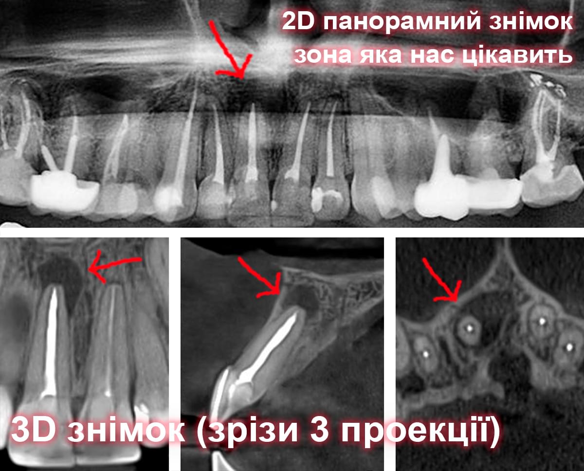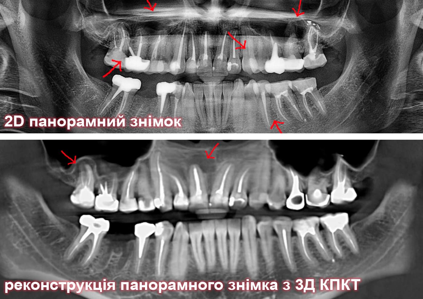 Головний недолік 2D-рентгену — це площинне зображення. Зуби, корені, щільна кістка та гайморові пазухи накладаються один на одного, створюючи «візуальний шум».