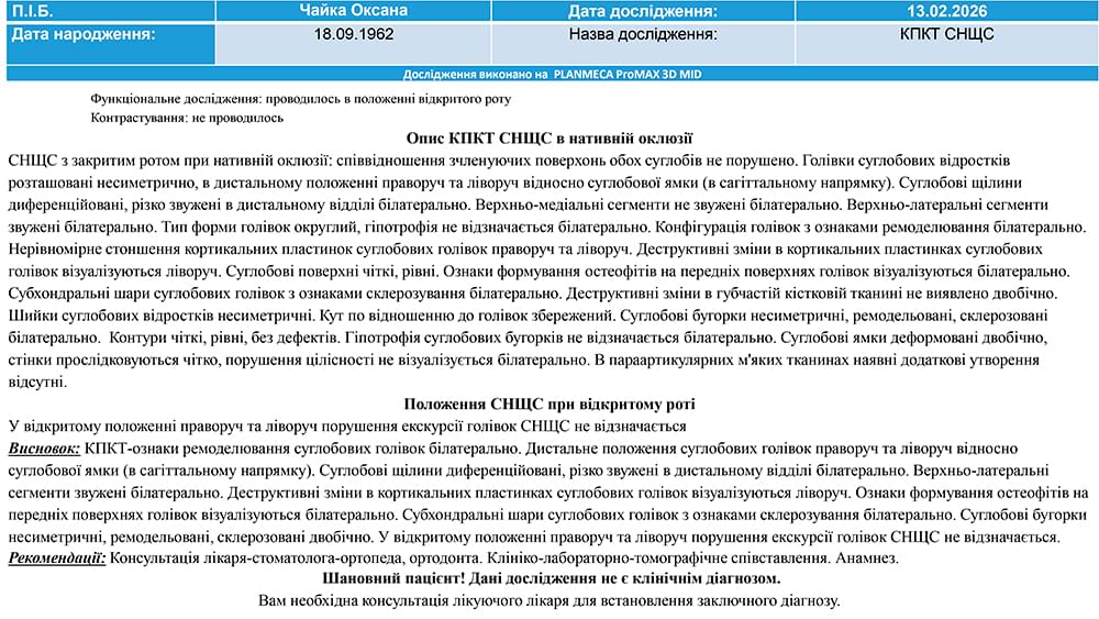 Знімок КТ — це величезний масив даних. Іноді вашому лікуючому лікарю (стоматологу-ортопеду, ортодонту або щелепно-лицьовому хірургу) потрібна допомога вузькопрофільного фахівця — лікаря-рентгенолога, щоб не пропустити жодної деталі. Рентгенологічний опис — це медичний документ, в якому сертифікований лікар-рентгенолог детально описує стан усіх анатомічних структур, виявлених на знімку, та фіксує будь-які відхилення від норми.